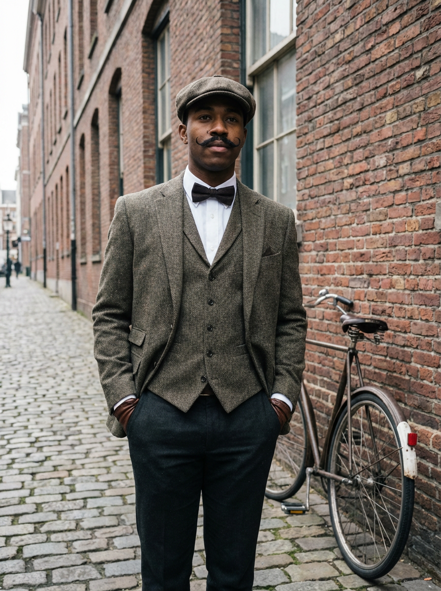 model with handlebar mustache, styled and waxed, vintage gentleman aesthetic