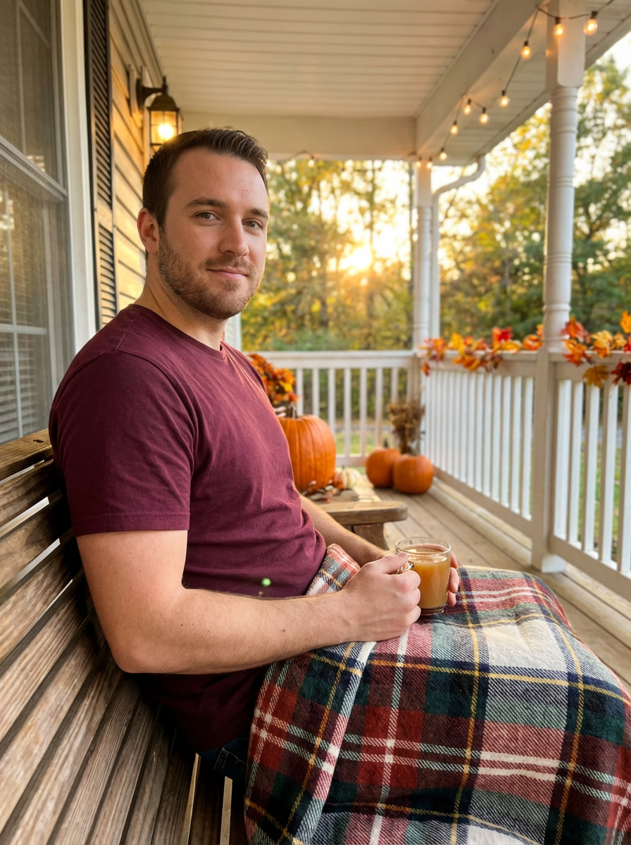 model with hot apple cider, cozy porch setting, fall decorations, wrapped in blanket, autumn afternoon