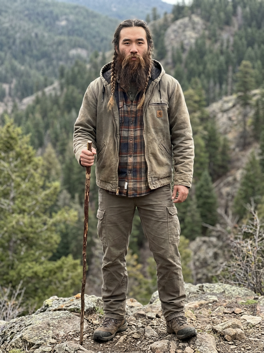 model with long viking beard, natural and masculine, outdoor rugged setting