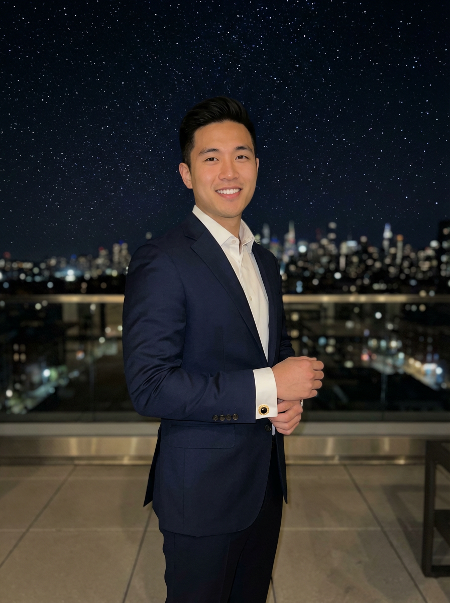 model with magnetic appeal, adorned in luxurious cufflinks, against a starry night backdrop