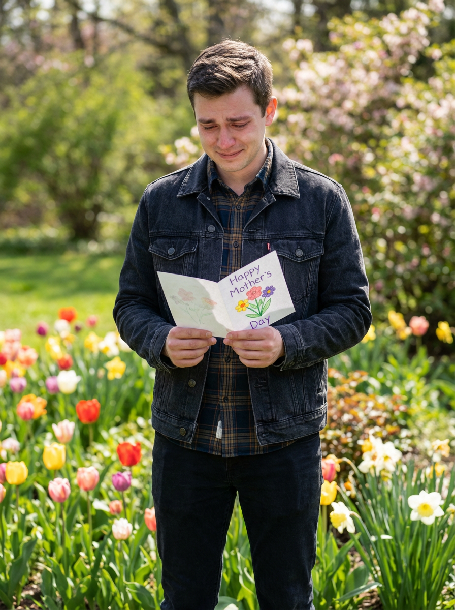 model with Mothers Day card, heartfelt moment, spring flowers visible, emotional connection