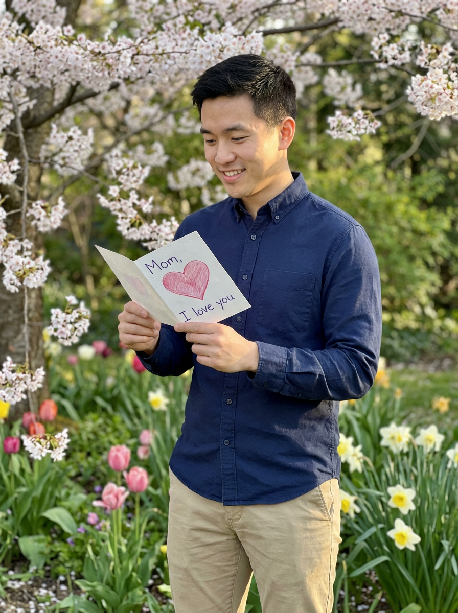 model with Mothers Day card, heartfelt moment, spring flowers visible, emotional connection