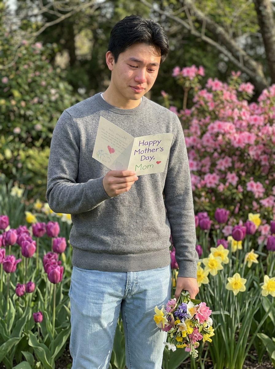model with Mothers Day card, heartfelt moment, spring flowers visible, emotional connection