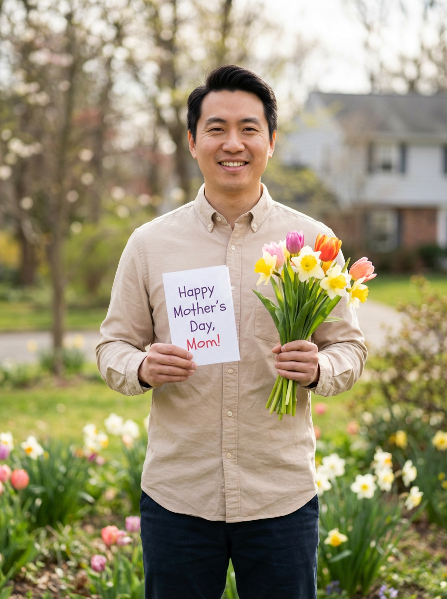 model with Mothers Day card, heartfelt moment, spring flowers visible, emotional connection
