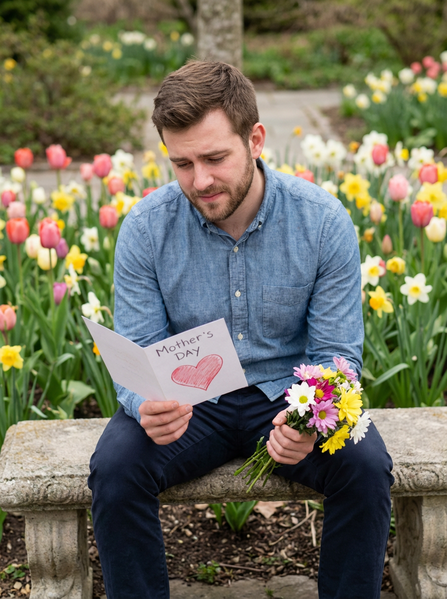 model with Mothers Day card, heartfelt moment, spring flowers visible, emotional connection
