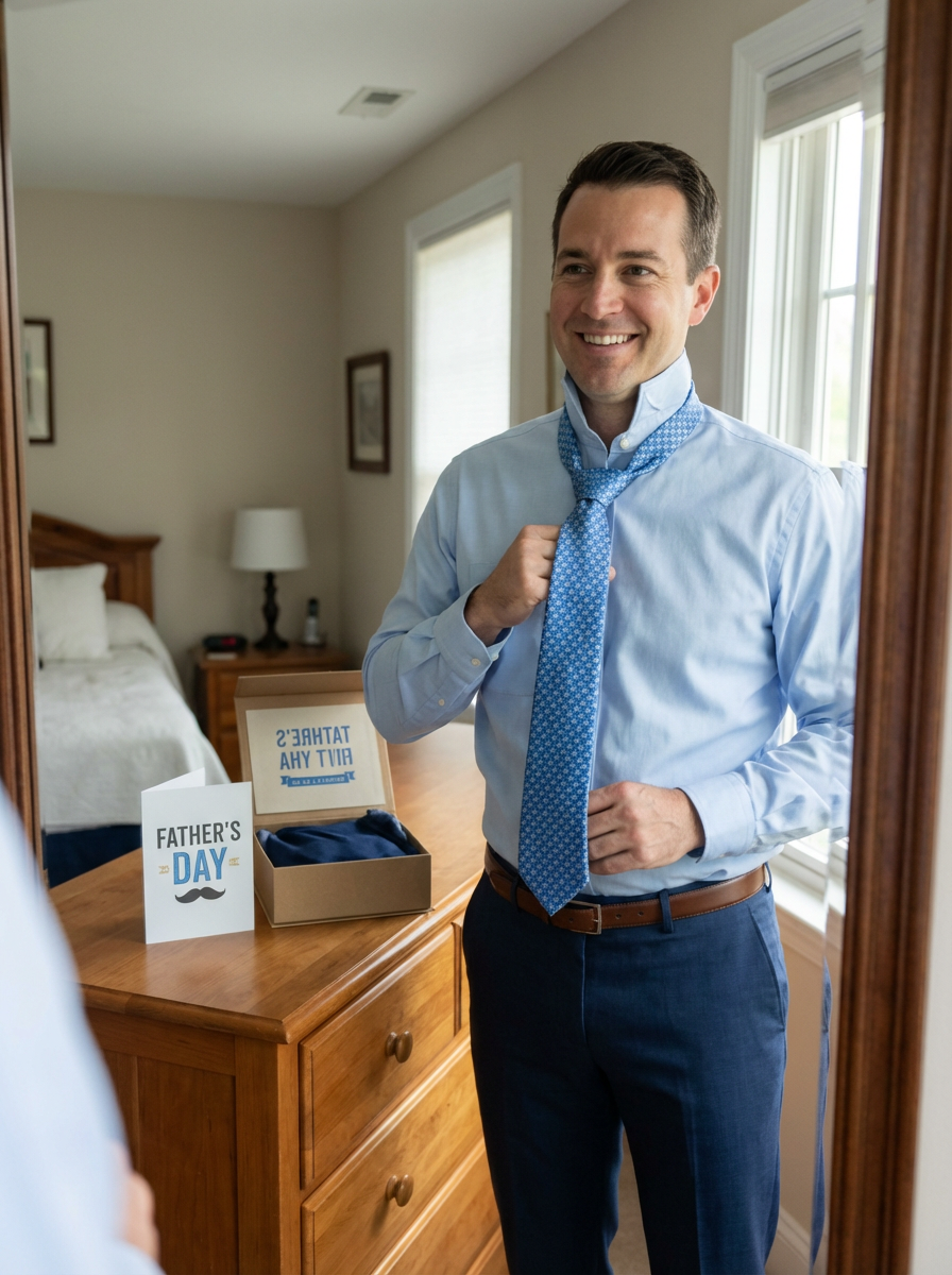 model with new tie gift, classic Fathers Day present, trying on tie, mirror or home setting