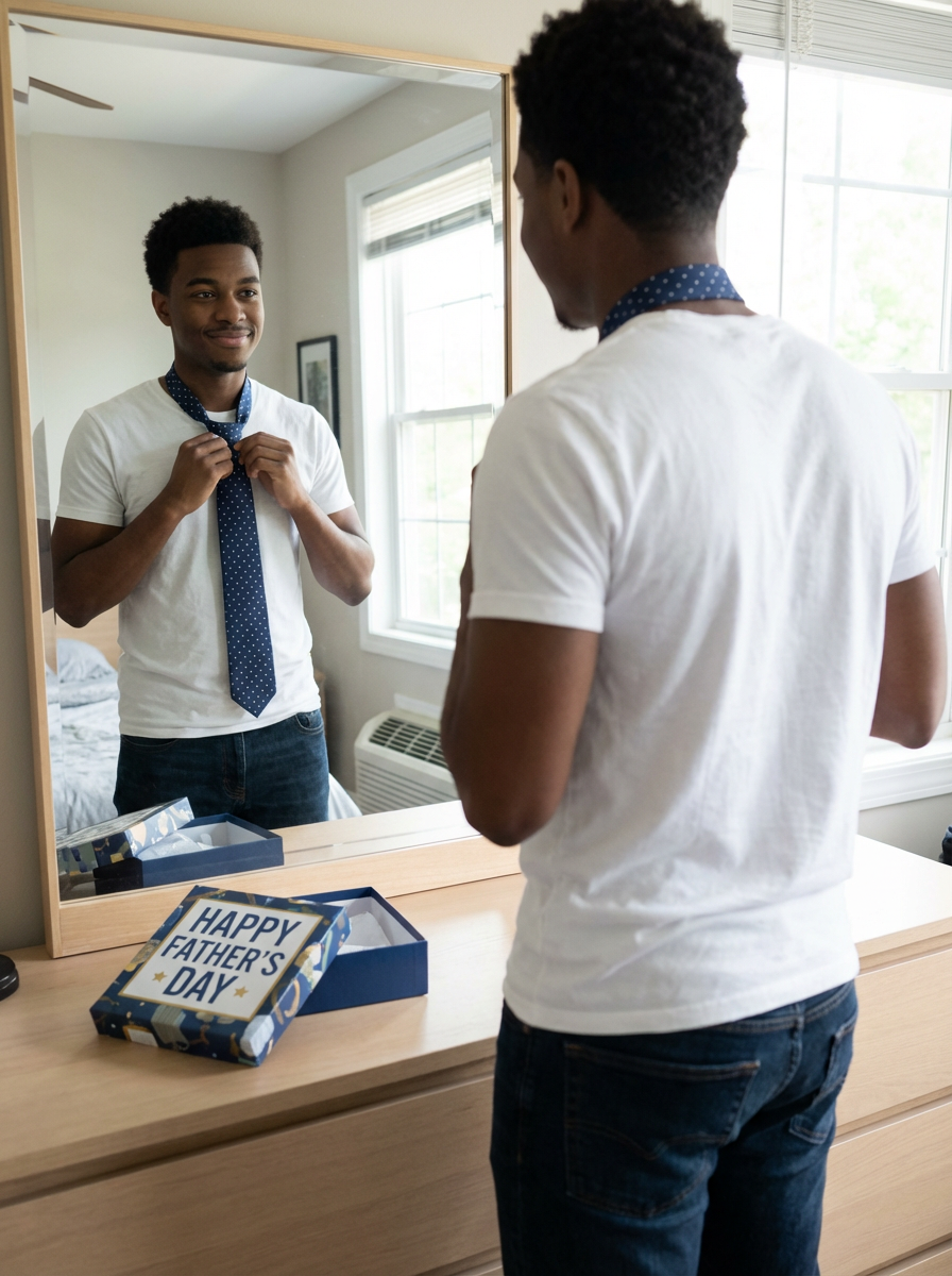 model with new tie gift, classic Fathers Day present, trying on tie, mirror or home setting