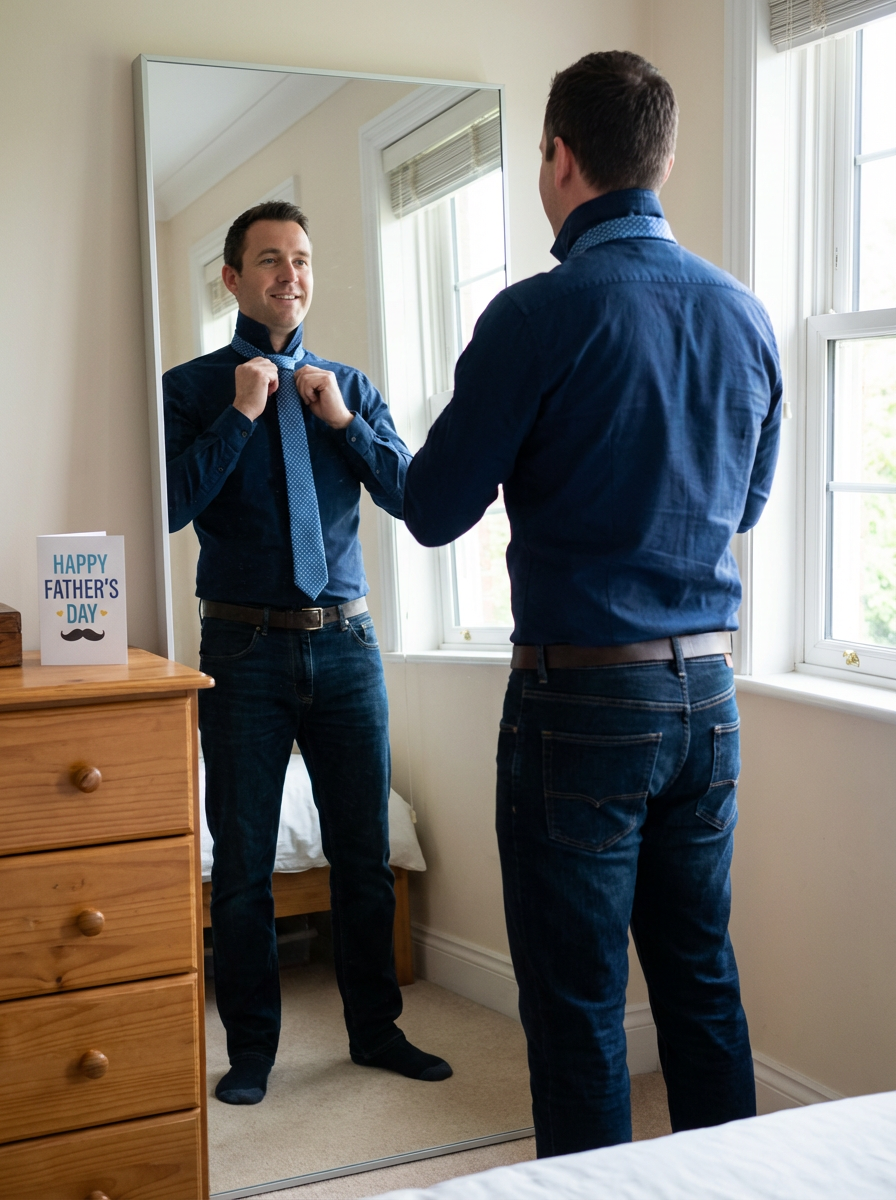model with new tie gift, classic Fathers Day present, trying on tie, mirror or home setting