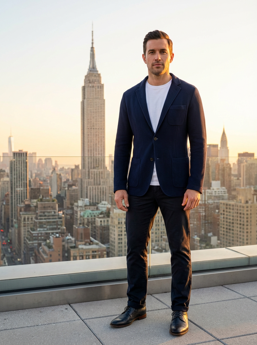 model with New York skyline view, rooftop setting, Empire State Building visible, chic outfit, sunset lighting