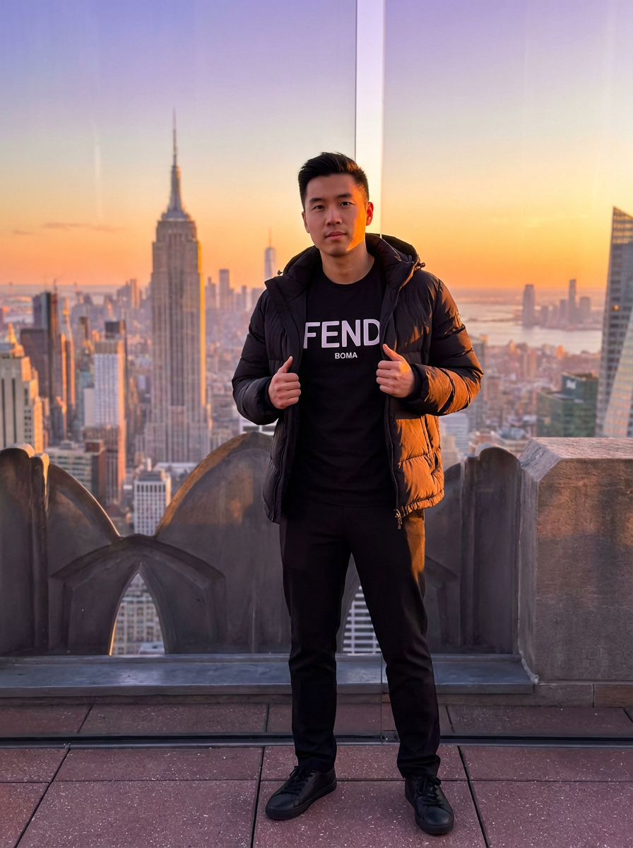 model with New York skyline view, rooftop setting, Empire State Building visible, chic outfit, sunset lighting