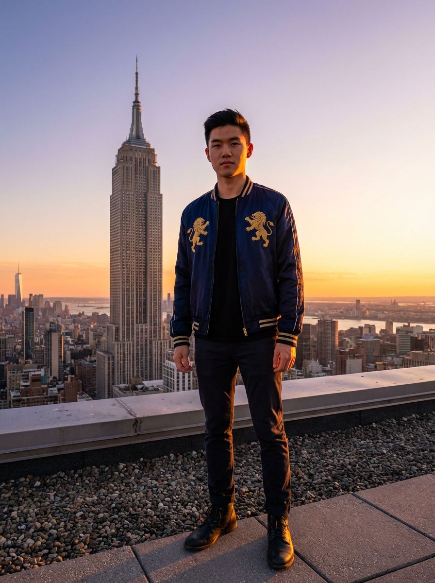 model with New York skyline view, rooftop setting, Empire State Building visible, chic outfit, sunset lighting