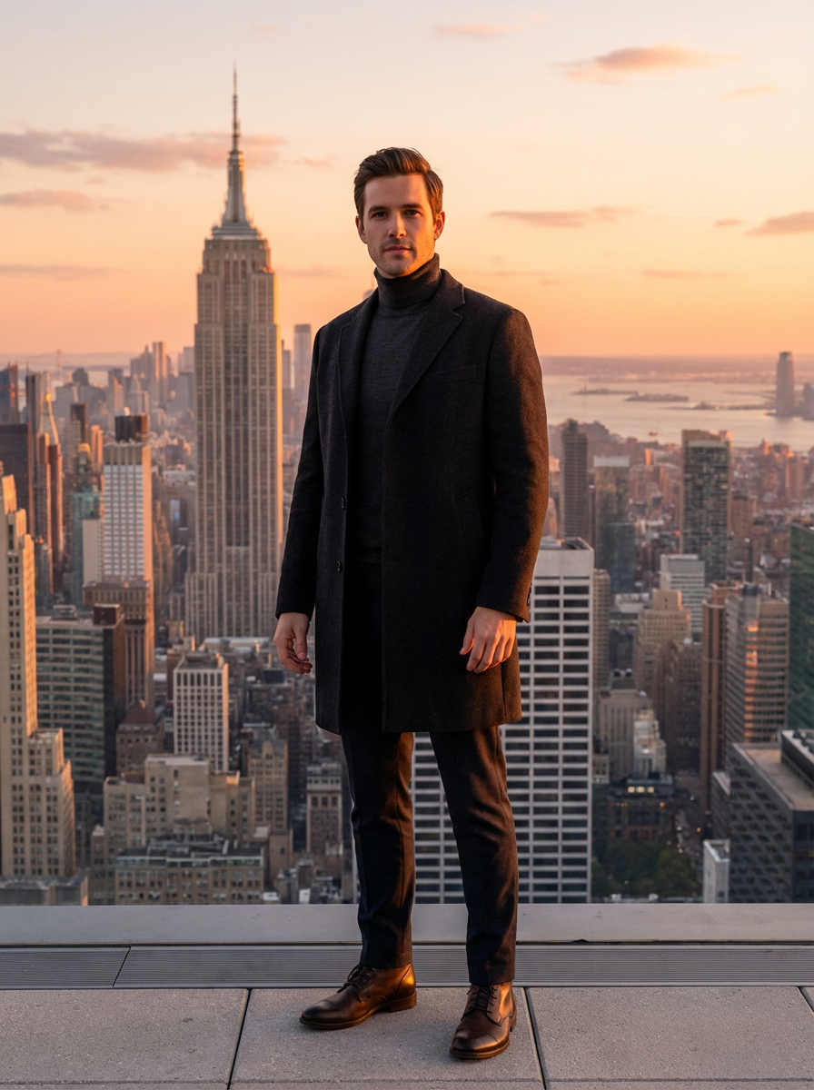 model with New York skyline view, rooftop setting, Empire State Building visible, chic outfit, sunset lighting
