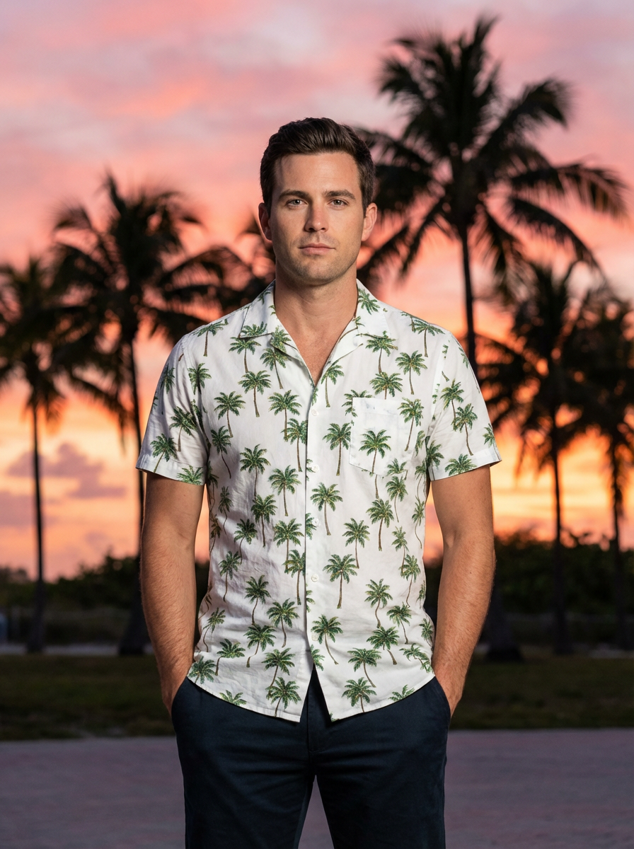 model with palm trees and pink sunset, quintessential Miami aesthetic, summer style