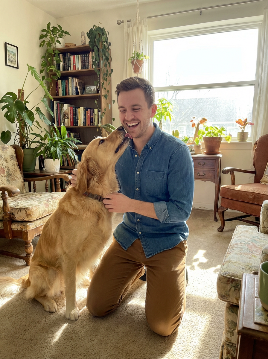 model with pet, animal lover vibes, genuine happy interaction, home or park setting