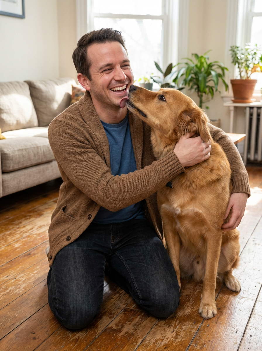 model with pet, animal lover vibes, genuine happy interaction, home or park setting