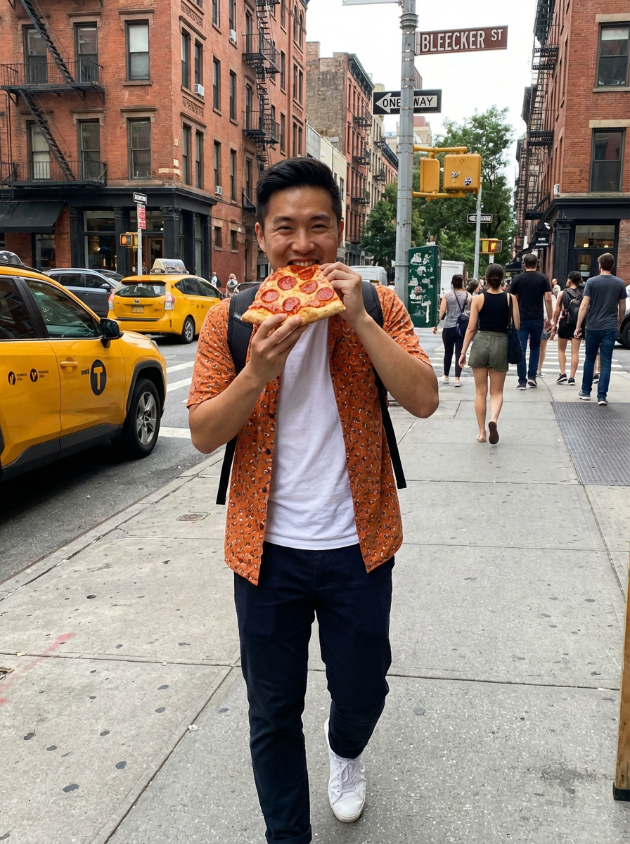 model with pizza slice, classic NYC moment, street scene, casual tourist style, fun expression