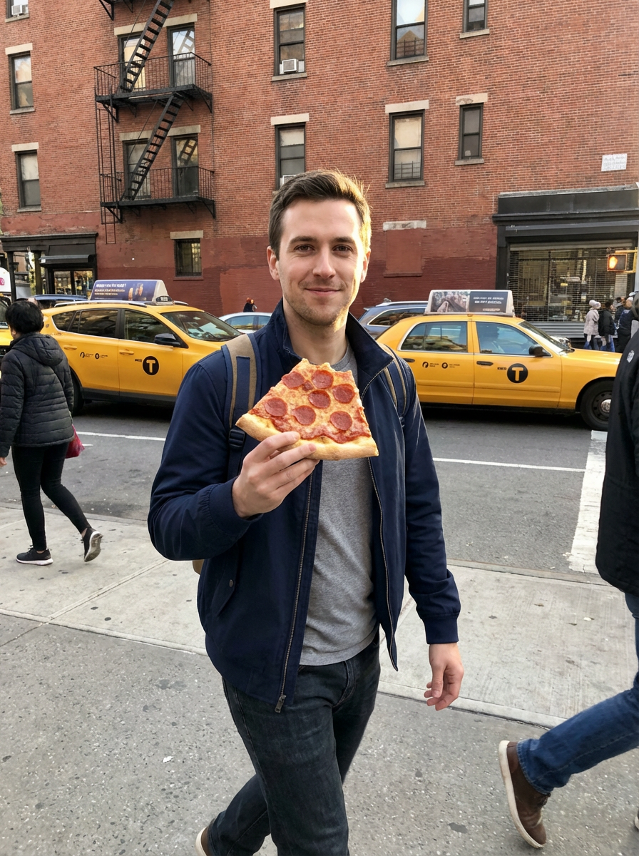 model with pizza slice, classic NYC moment, street scene, casual tourist style, fun expression