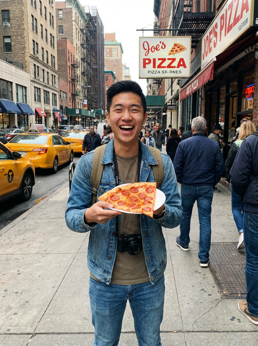 model with pizza slice, classic NYC moment, street scene, casual tourist style, fun expression