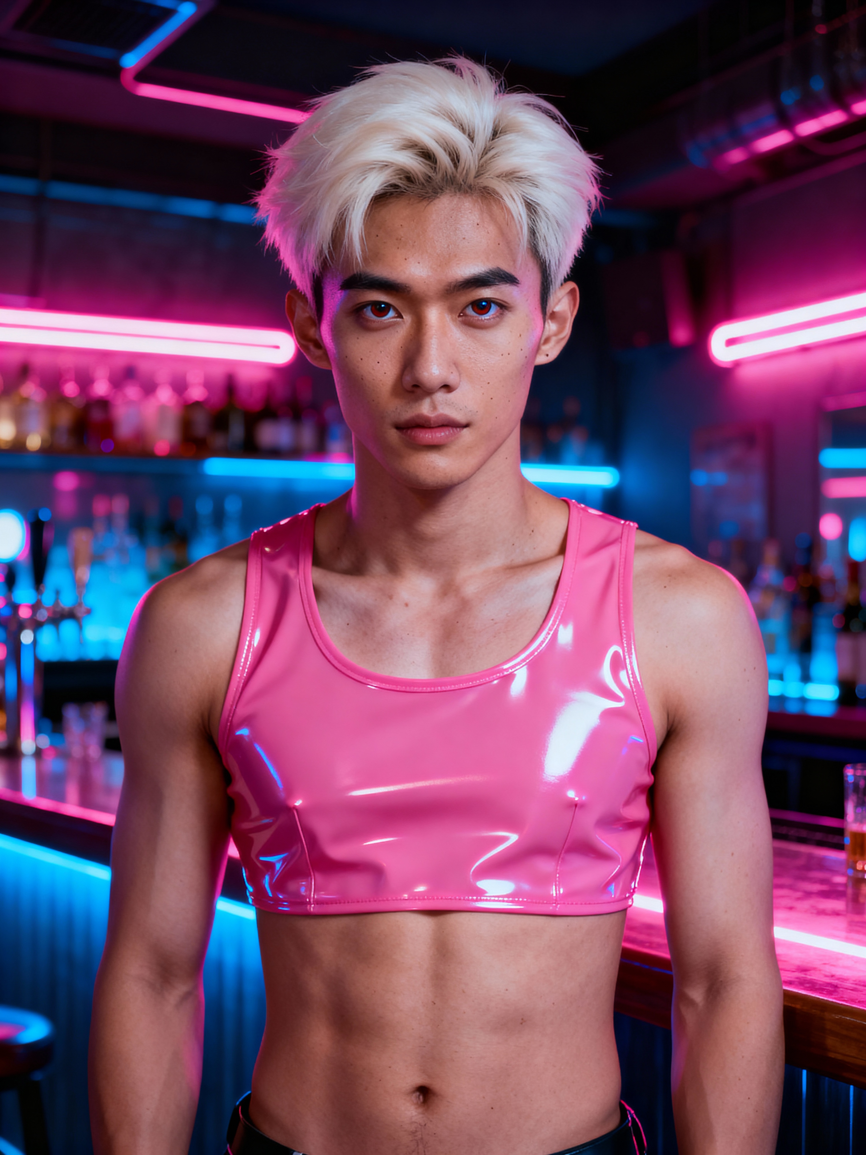 model with platinum blonde hair, in neon bar, cyberpunk, pink latex crop top, professional award winning photography, beautiful detailed eyes, highly detailed glossy eyes, high detailed skin, skin pores