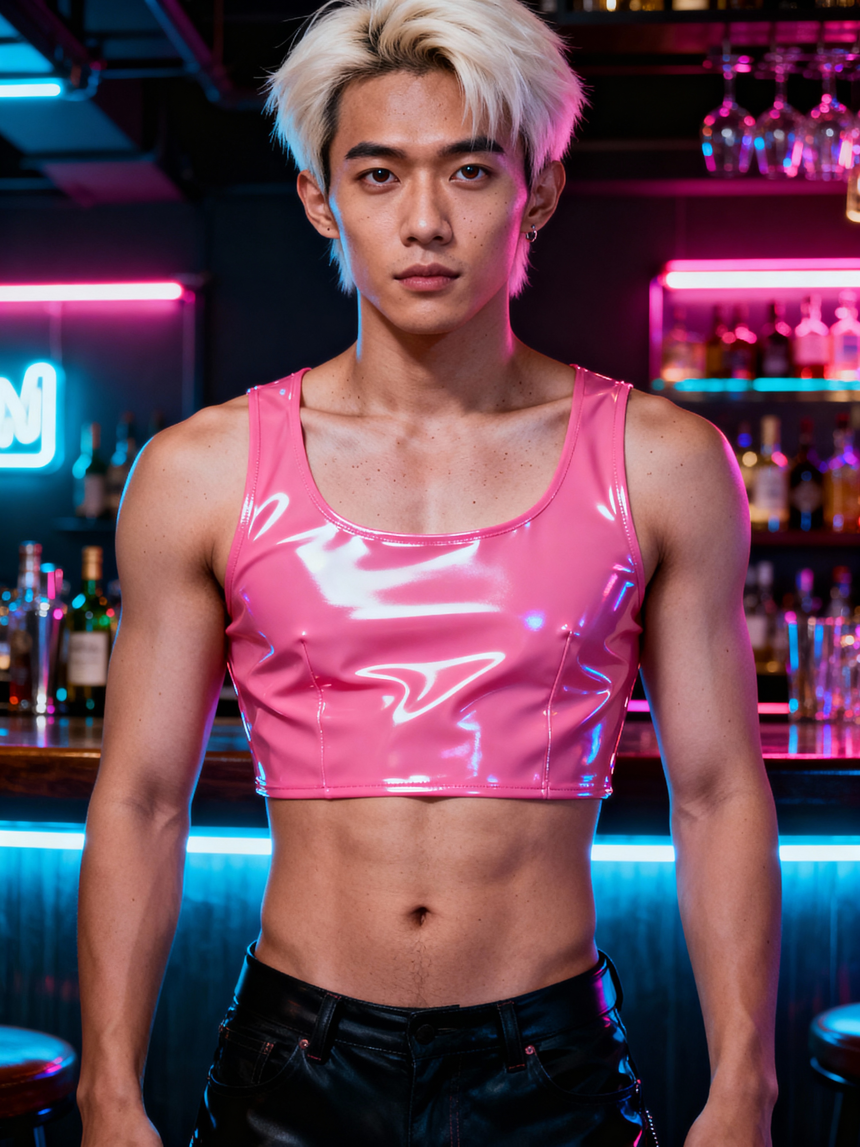 model with platinum blonde hair, in neon bar, cyberpunk, pink latex crop top, professional award winning photography, beautiful detailed eyes, highly detailed glossy eyes, high detailed skin, skin pores