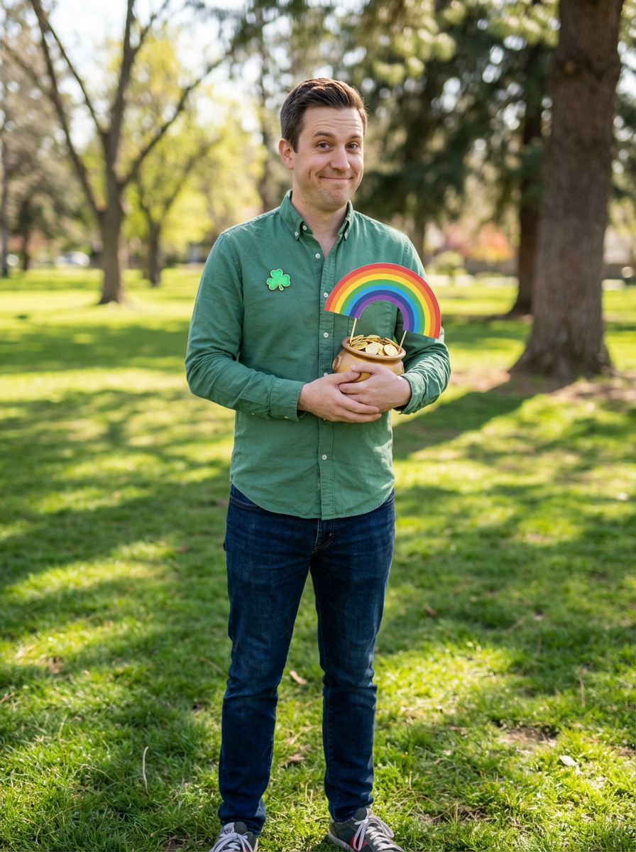 model with pot of gold and rainbow props, playful St Patricks Day theme, green outfit, fun expression