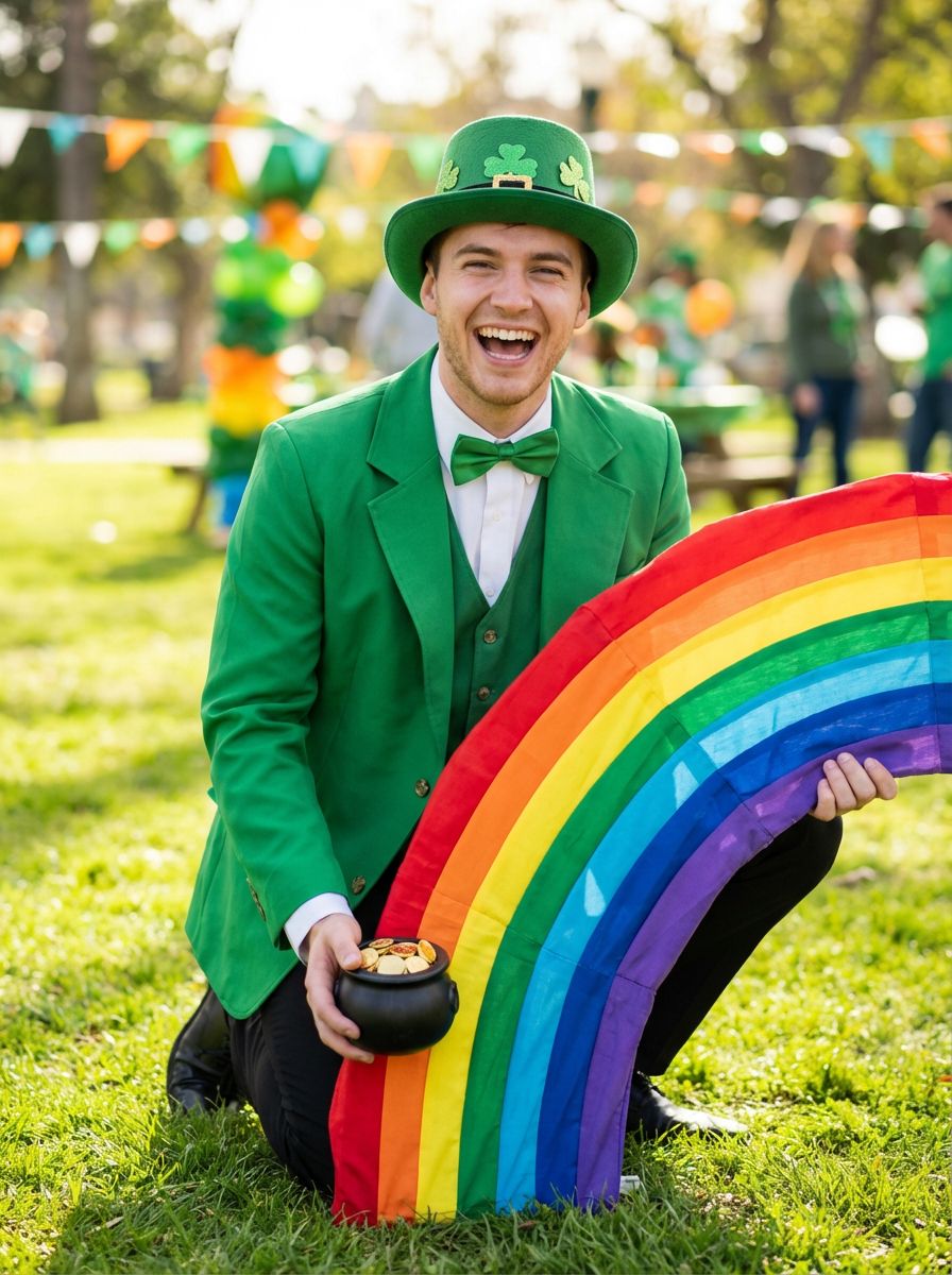 model with pot of gold and rainbow props, playful St Patricks Day theme, green outfit, fun expression