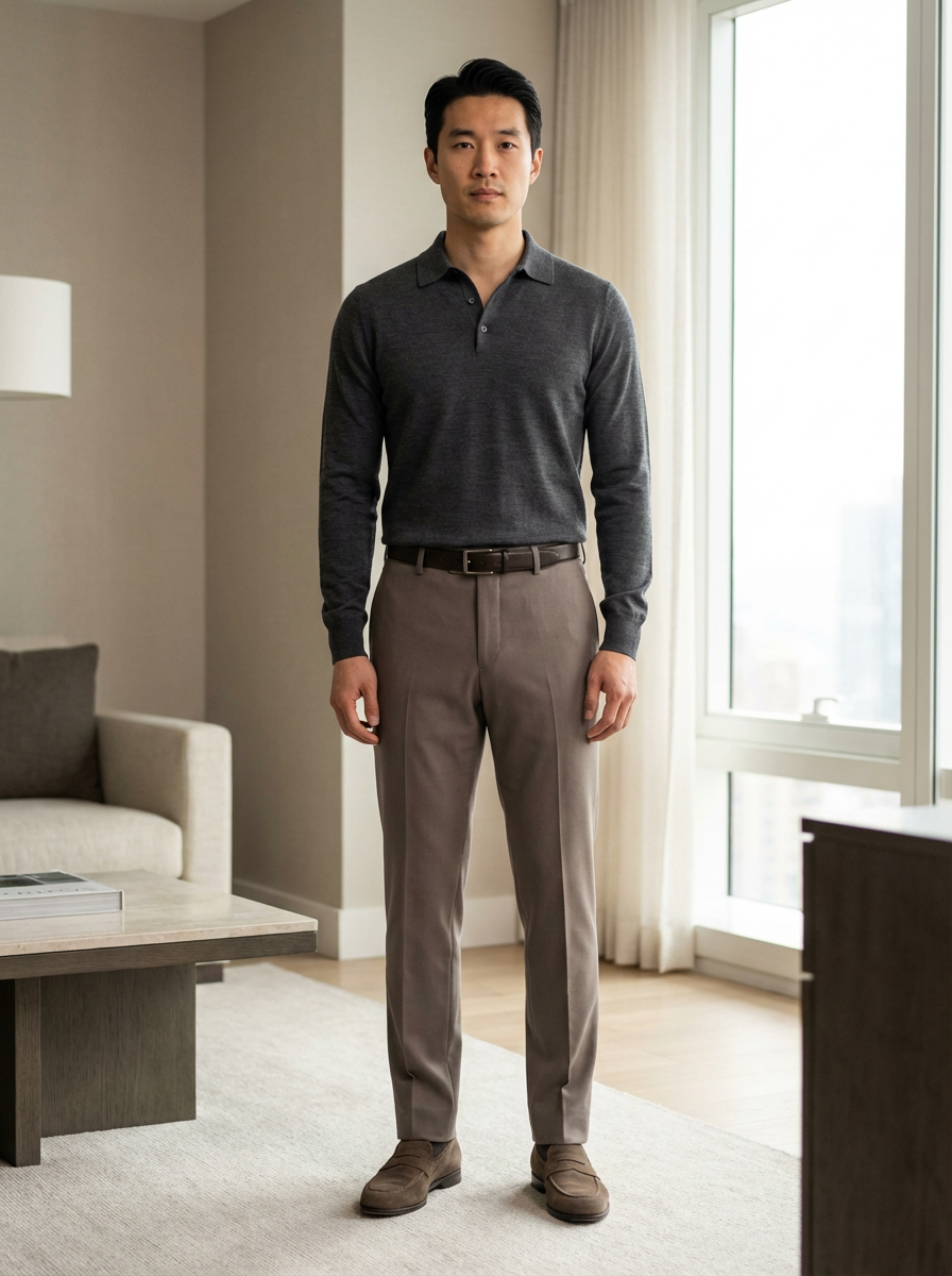 model with quiet luxury aesthetic, fine knit polo, leather belt, neutral tones, upscale interior