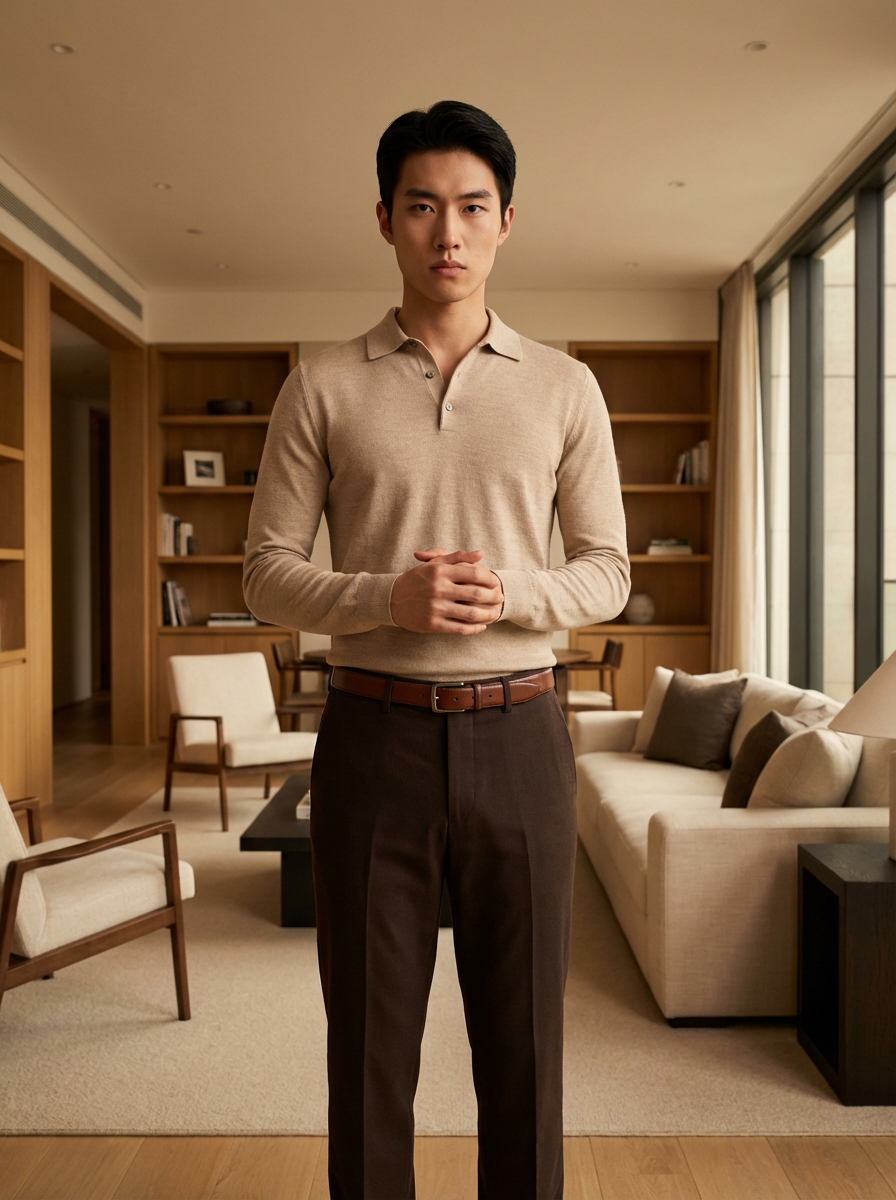 model with quiet luxury aesthetic, fine knit polo, leather belt, neutral tones, upscale interior