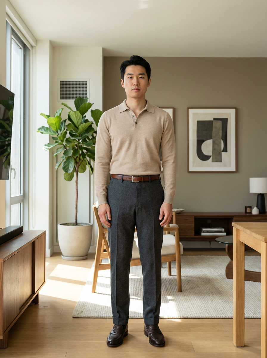 model with quiet luxury aesthetic, fine knit polo, leather belt, neutral tones, upscale interior