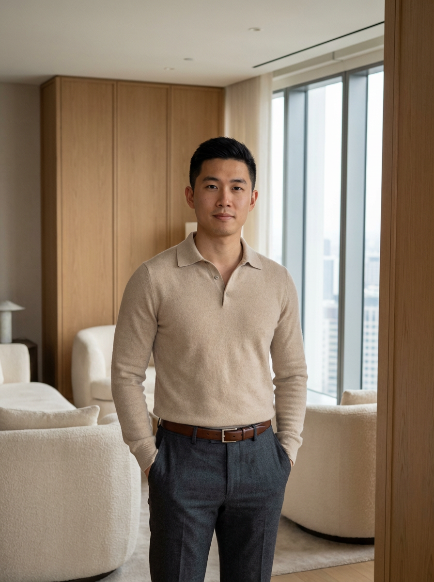 model with quiet luxury aesthetic, fine knit polo, leather belt, neutral tones, upscale interior