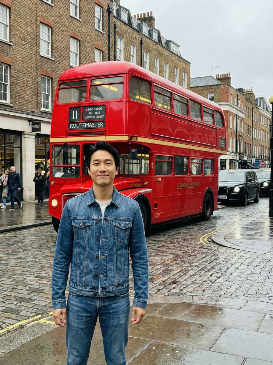 model with red double decker bus, London street scene, classic British aesthetic