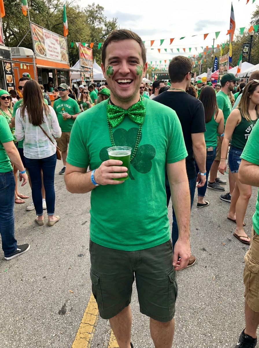 model with shamrock face paint, festival fun, green clothing, outdoor celebration