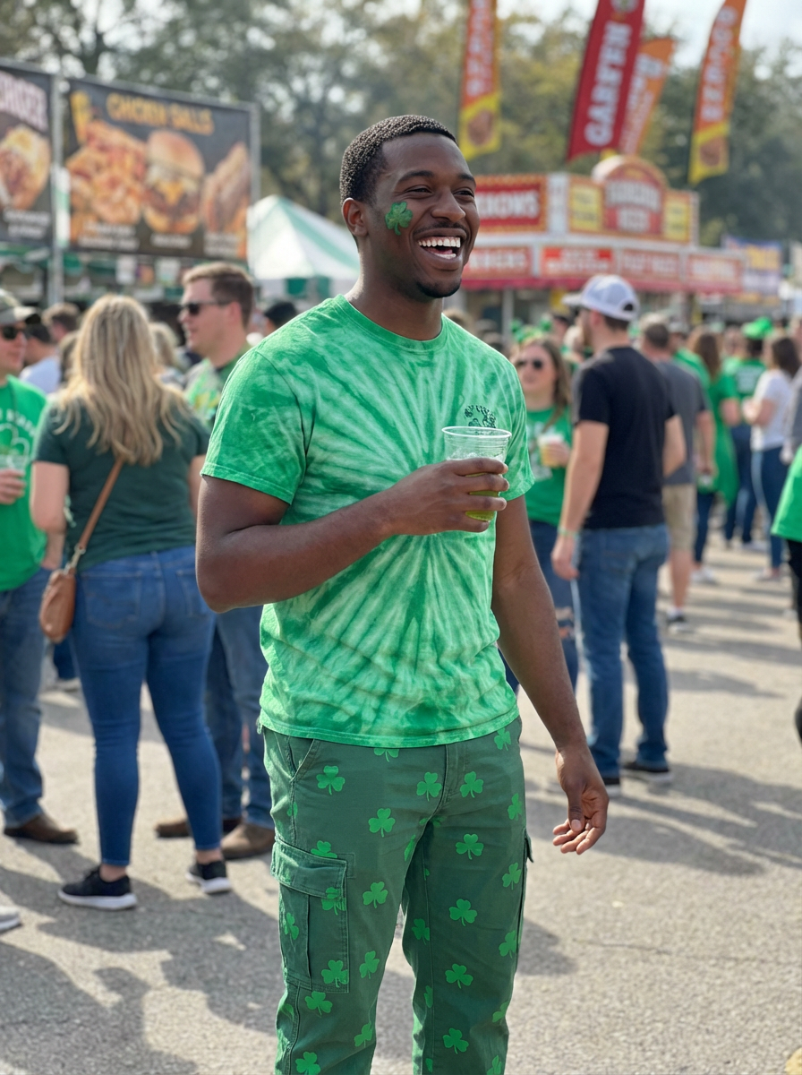 model with shamrock face paint, festival fun, green clothing, outdoor celebration