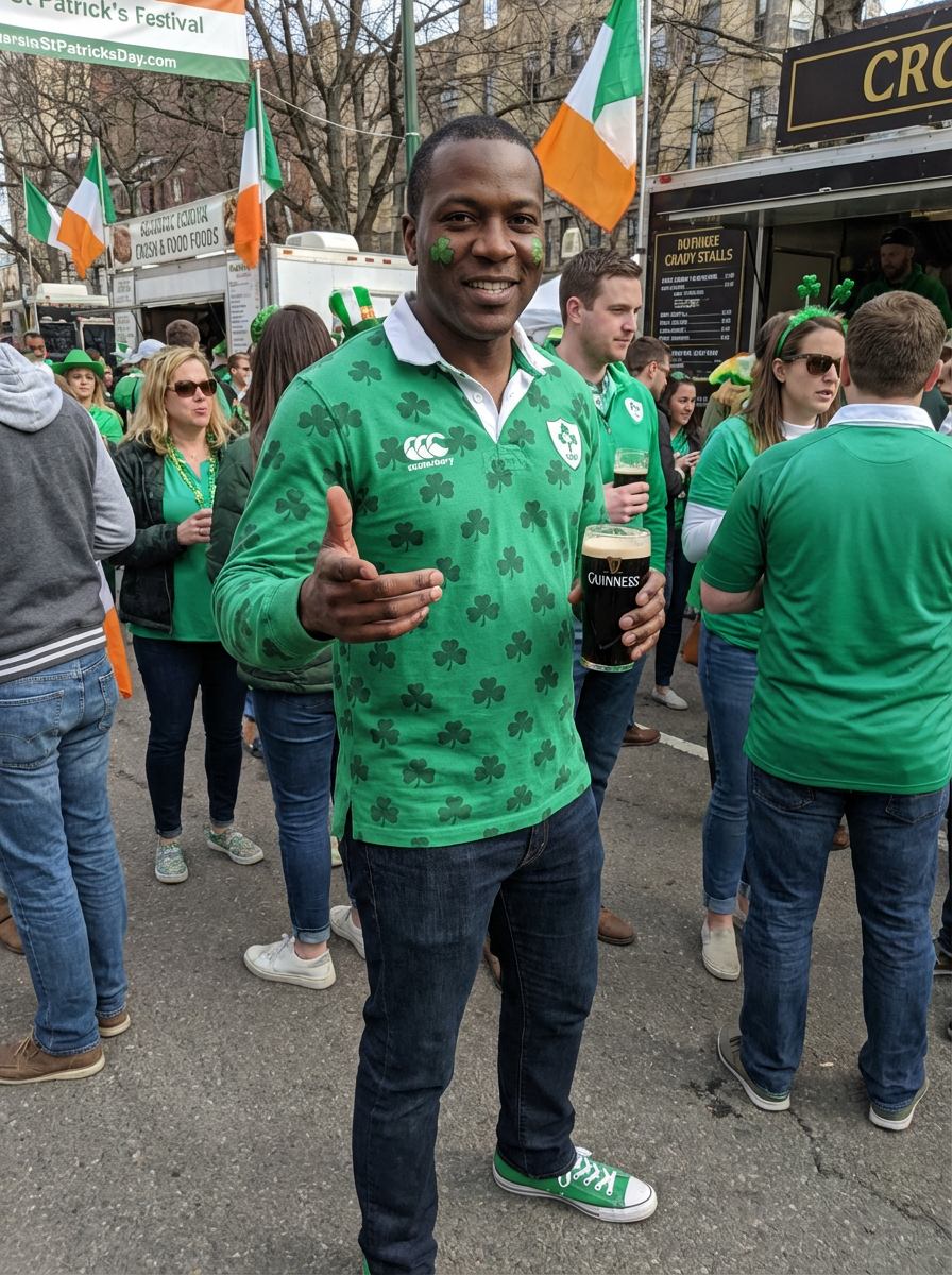 model with shamrock face paint, festival fun, green clothing, outdoor celebration