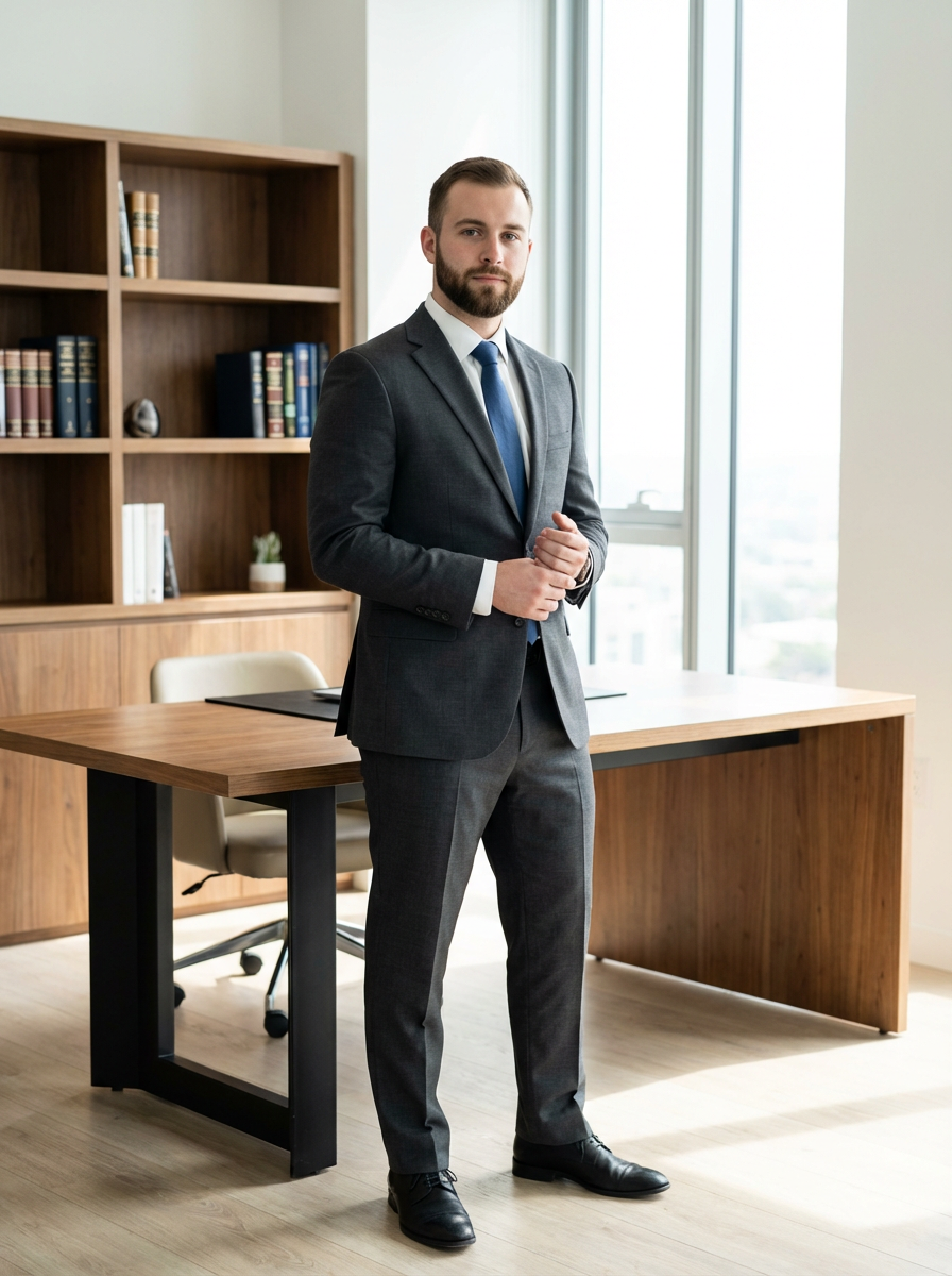 model with short boxed beard, clean lines, professional appearance, office setting