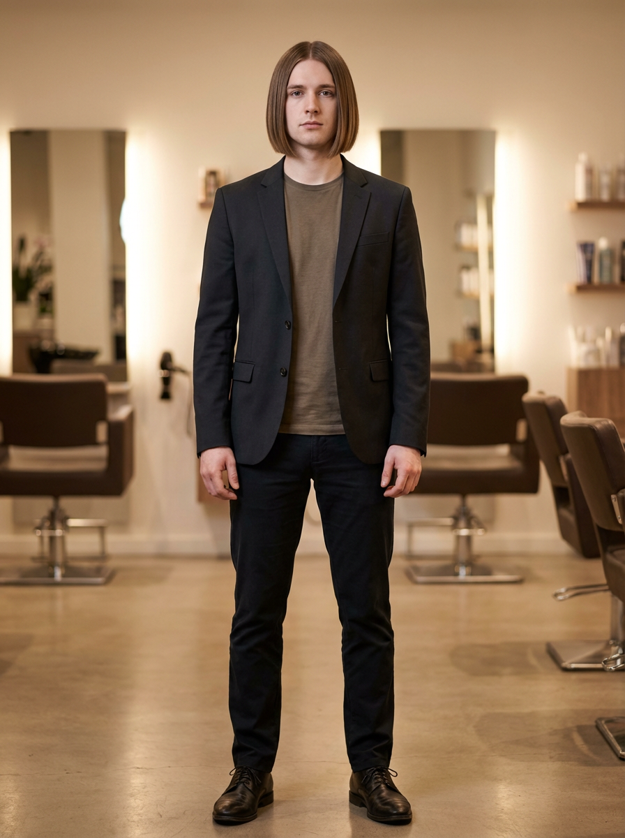 model with sleek bob haircut, chin length, straight and shiny, professional salon lighting, front view