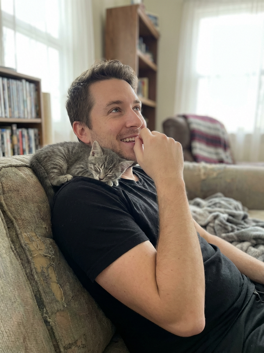 model with sleepy kitten on shoulder, adorable moment, soft indoor lighting, comfortable home setting