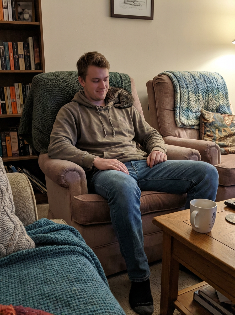 model with sleepy kitten on shoulder, adorable moment, soft indoor lighting, comfortable home setting