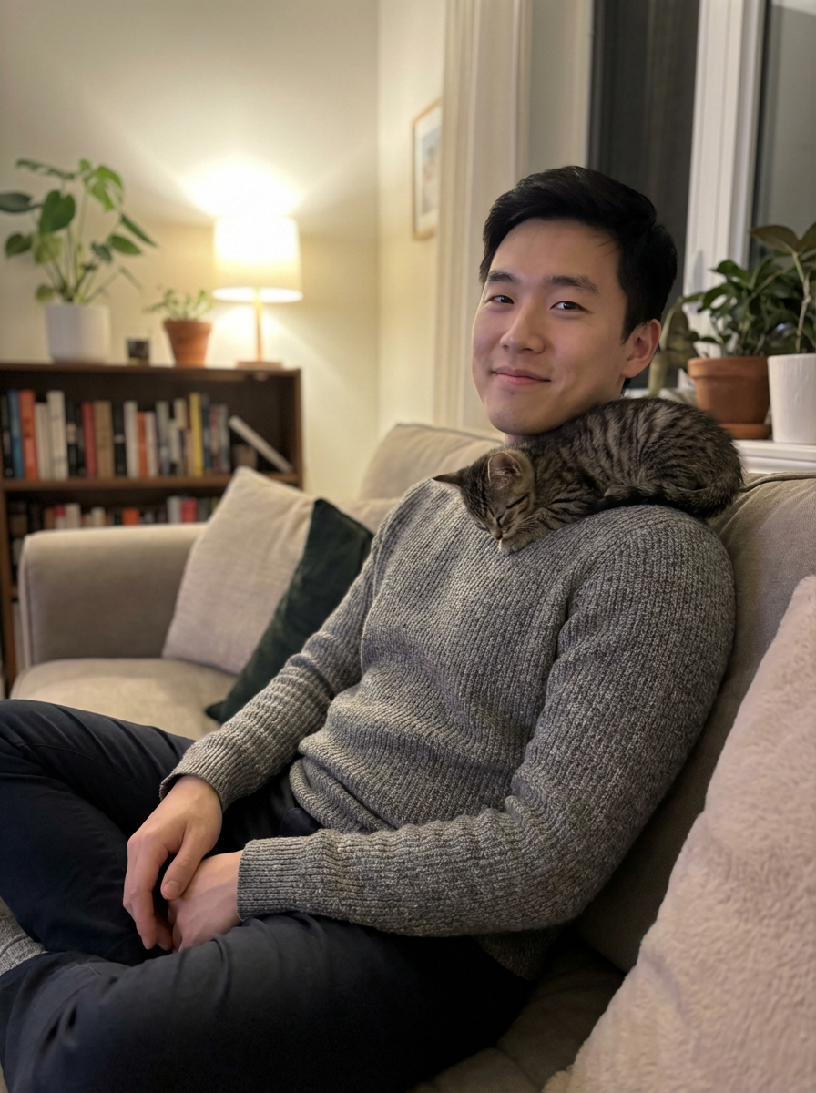 model with sleepy kitten on shoulder, adorable moment, soft indoor lighting, comfortable home setting