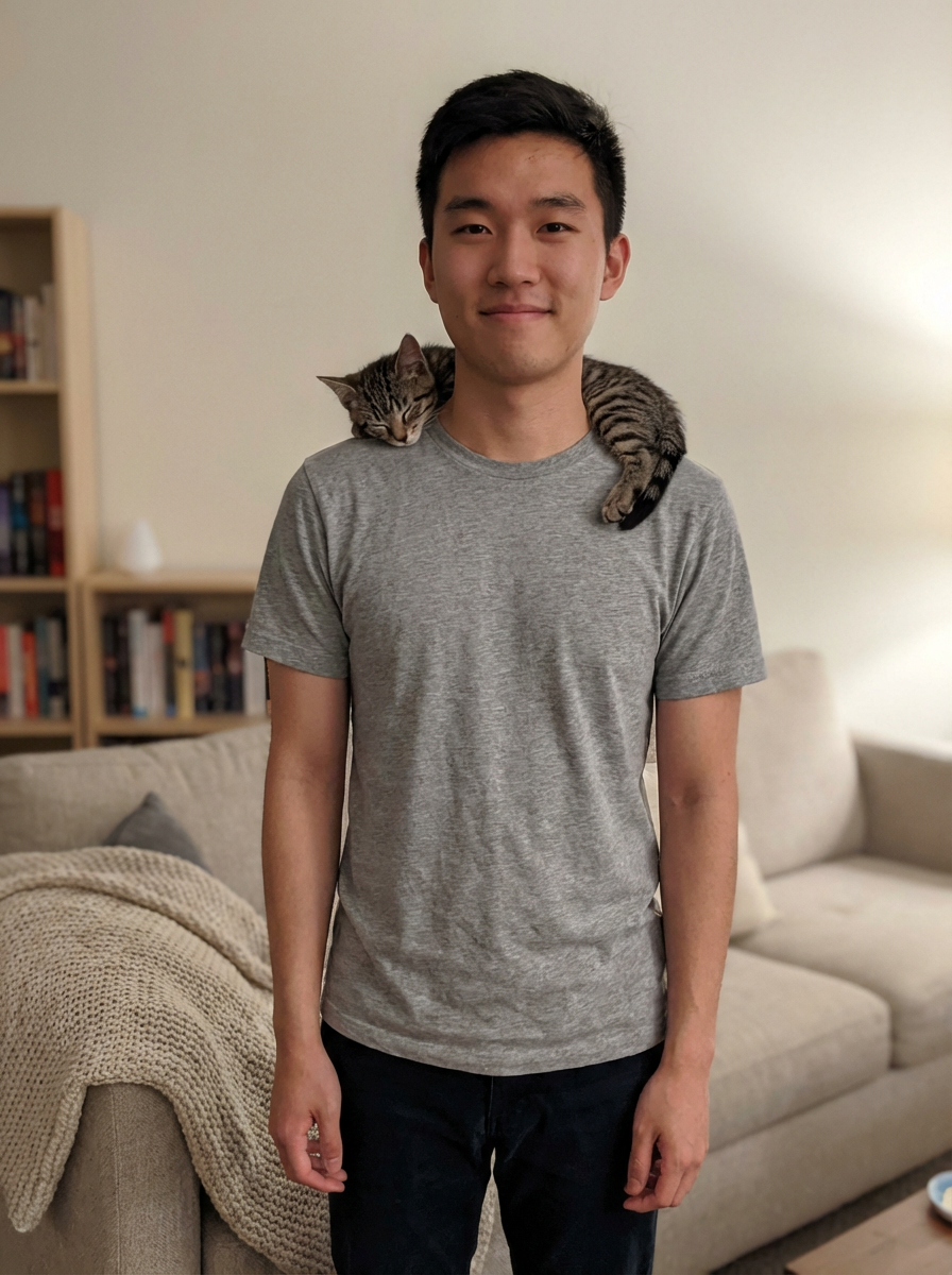 model with sleepy kitten on shoulder, adorable moment, soft indoor lighting, comfortable home setting