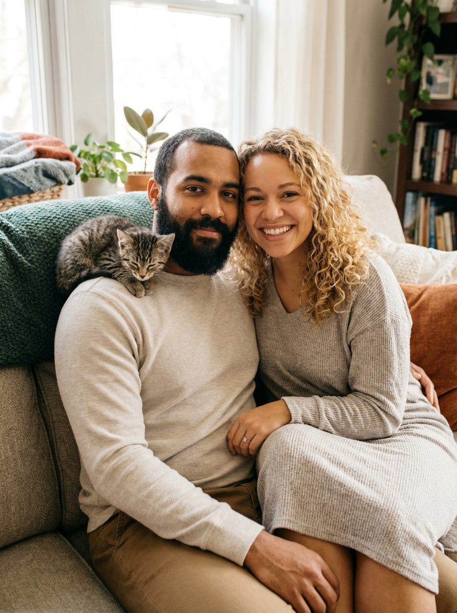 model with sleepy kitten on shoulder, adorable moment, soft indoor lighting, comfortable home setting
