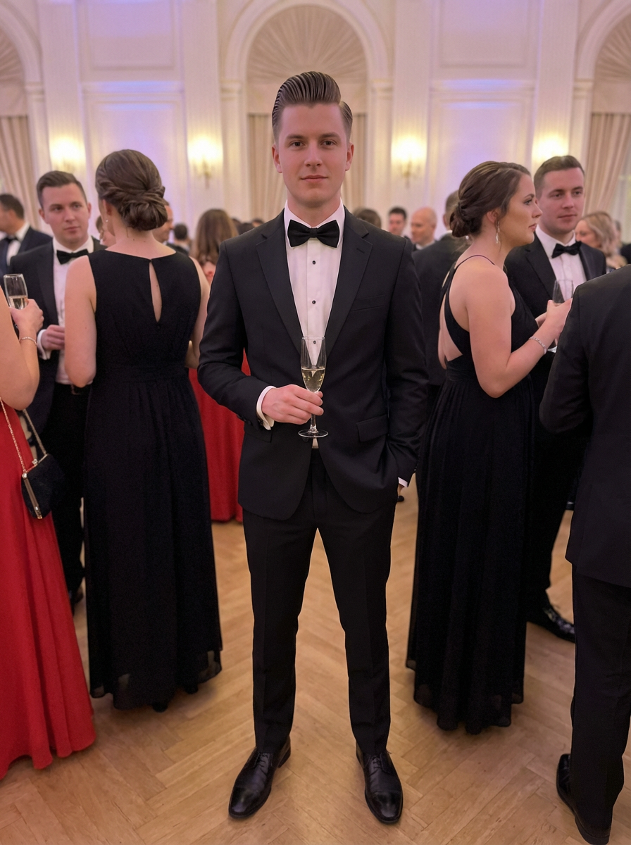 model with slicked back pompadour, formal event ready