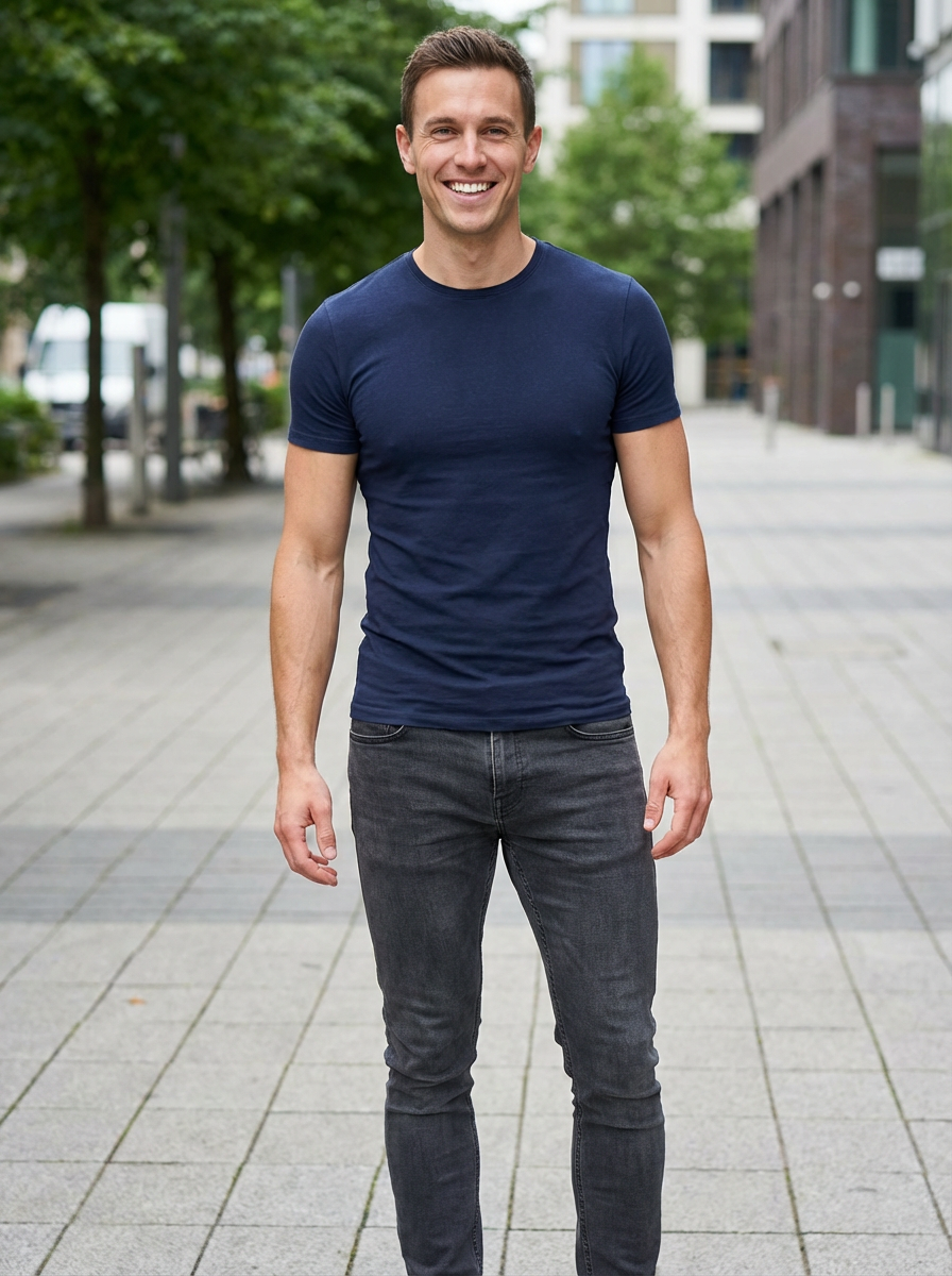 model with slim fit body, wearing fitted shirt showing trim physique, happy confident expression