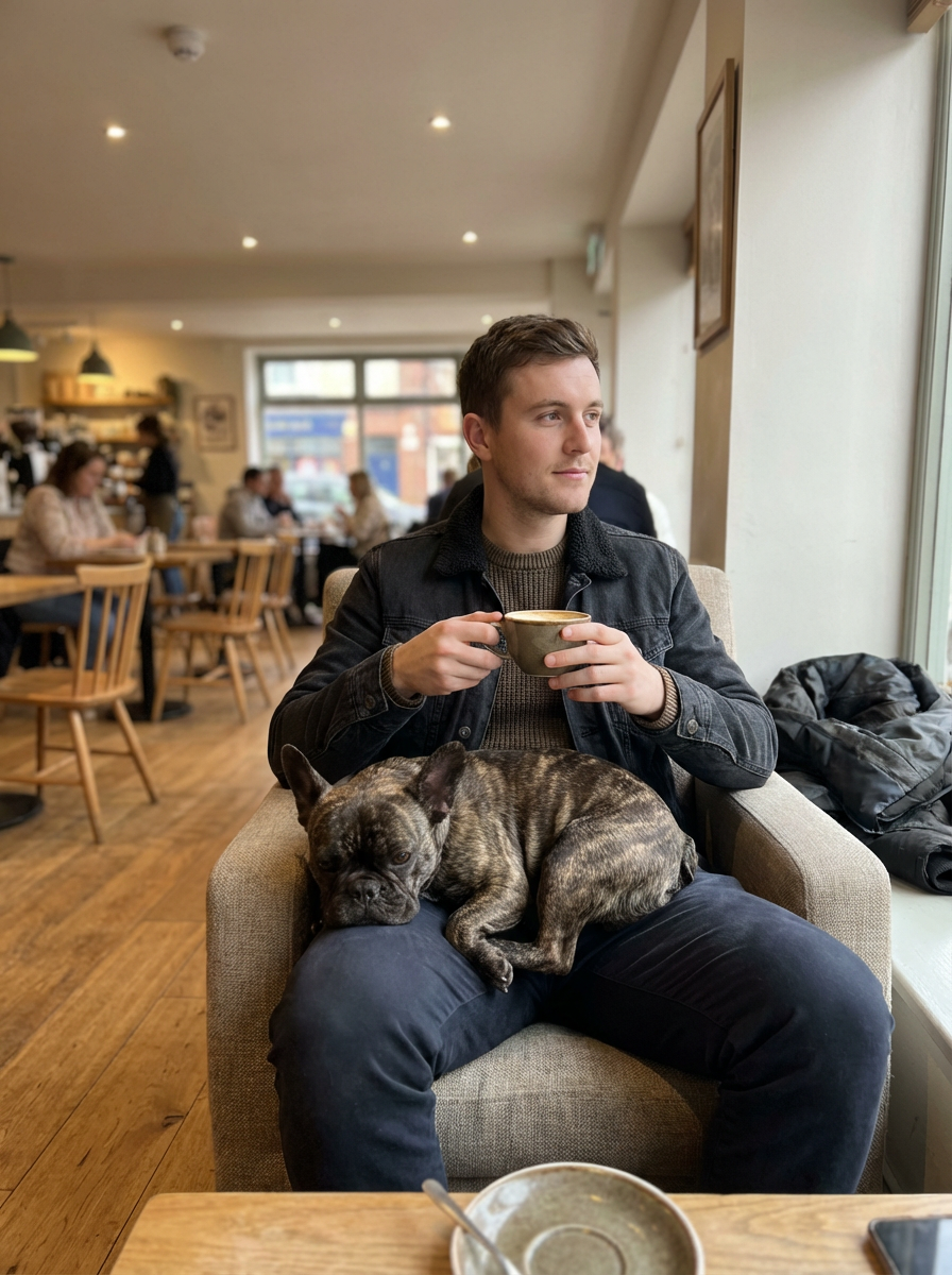 model with small french bulldog on lap, cafe setting, casual stylish outfit, relaxed atmosphere
