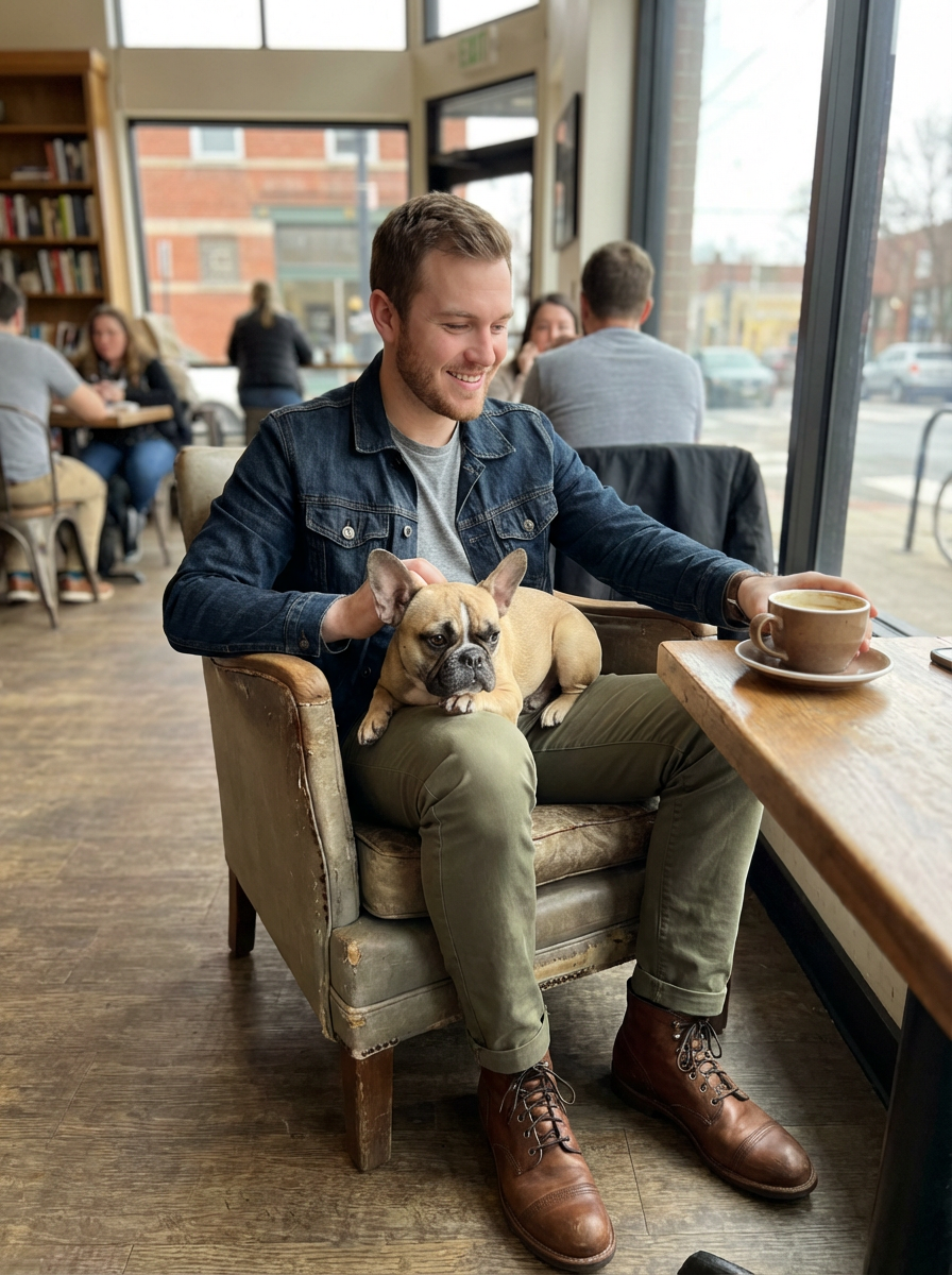 model with small french bulldog on lap, cafe setting, casual stylish outfit, relaxed atmosphere