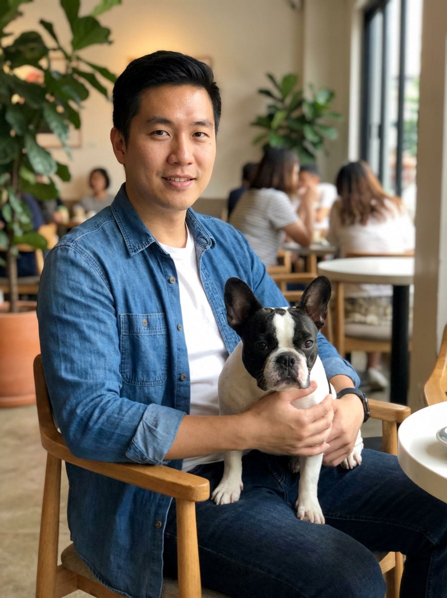 model with small french bulldog on lap, cafe setting, casual stylish outfit, relaxed atmosphere
