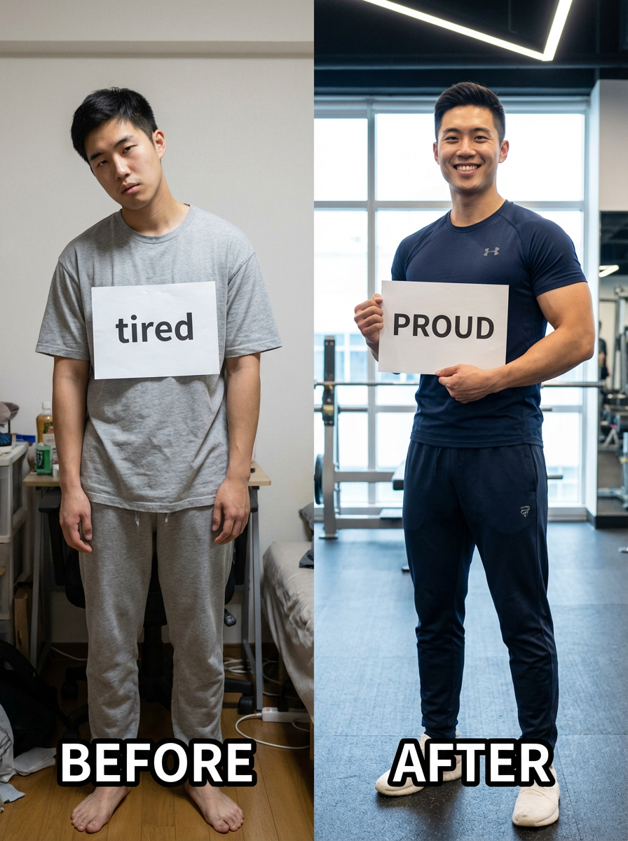model with transformation physique, before and after energy, confident in fitted clothing, proud expression