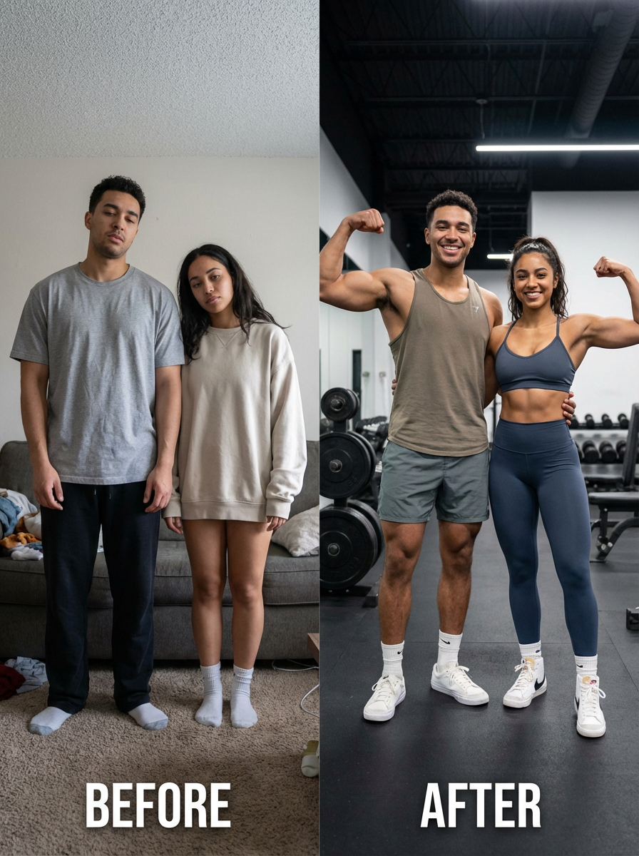 model with transformation physique, before and after energy, confident in fitted clothing, proud expression