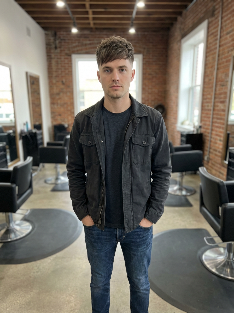 model with trendy layered cut, textured layers on top, modern salon background