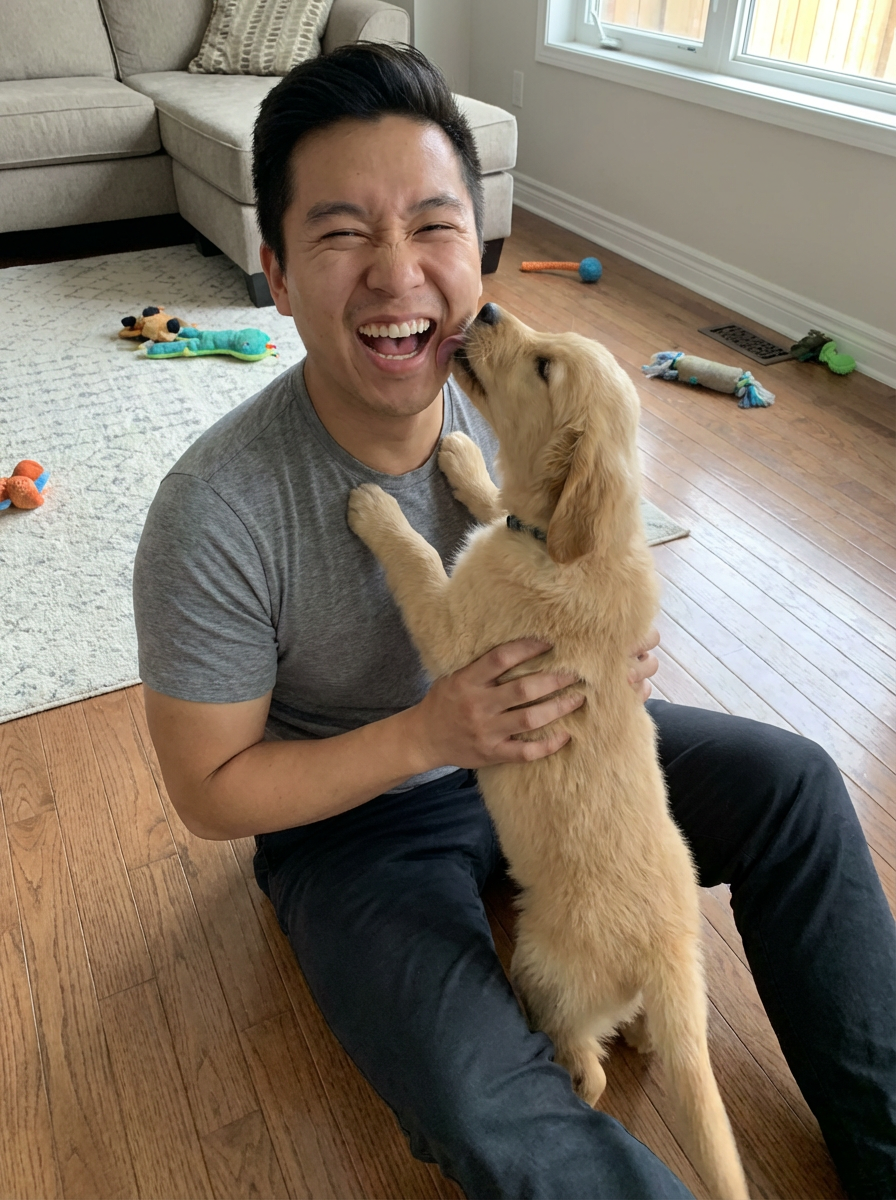 model with two puppies, overwhelmed with cuteness, playful scene, living room floor